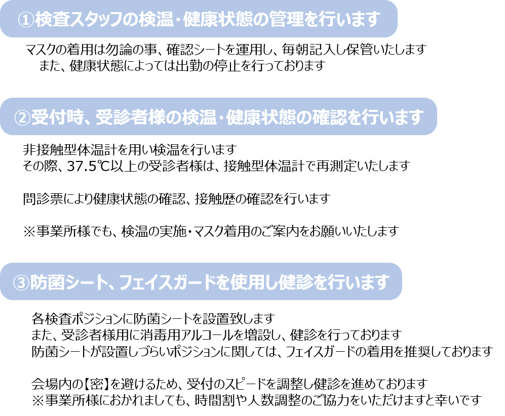 昨今の新型コロナウイルスの流行を受け、下記の対策を行っております